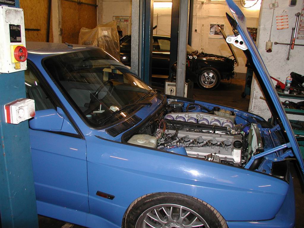 Hallo E30-Fans, Ich denke mal die Zeit ist "Reif" f�r die Vorstellung meines E30 M3�s.Hier also nun der Text und die Bilder die du ver�ffentlichen kannst wenn du m�chtest. Der E30 M3 finde ich, eignet sich doch am besten f�r solch einen Umbau, da schon div. Dinge ausgelegt sind um die "Mehrleistung" auch verkraften zu k�nnen. Dies ist ein Baujahr 1989er, Macaoblau und mit Vollleder Grau ausgestatteter. Nun ist der 3.8Liter M5 (S38) rein gekommen der zuvor komplett zerlegt und �berholt wurde. Anzumerken ist hier, das Selbst der Tempomat der vorher drin war auch weiterhin seinen Dienst tut. Ein eigens angefertigter gro�er Wasserk�hler und der �lk�hler vom M5 wurden nach vorn versetzt eingebaut inkl. einem gro�en E-L�fter der �ber zwei L�fterstufen l�uft ( 60C� und 95C� ). Gerade die Thermischen Probleme sollte man nicht untersch�tzen wenn man derartiges vor hat. Was das angeht, ist noch die Gummiabdichtung auf der die Motorhaube liegt auf etwa 40cm an der Windschutzscheibe mittig entfernt worden. Nun kann die warme Luft besser entweichen. Wenn ich fahre kommt die Temperatur nicht mal mehr auf 1/3 der Skala und um dicksten Stau auf der Autobahn steigt die Motorwassertemperatur jetzt nicht mehr �ber 105C�. Bevor nicht der gro�e E-L�fter und der M5 �lk�hler drin waren und die Gummidichtung eingeschnitten wurde, lief die Temperatur immer ins Unermessliche. Dazu muss man sagen das auch f�r die Wasserpumpe das kleinste Rad genommen wurde (S�dafrika Export Version). Weiterhin ist die Kupplung vom B7 eingesetzt und ein Differential vom B6 ( 2.93er ). Das Differential hat dann noch den Deckel vom M-Roadster bekommen um auch da die W�rme bestens abzuf�hren. Eine gek�rzte Kardanwelle musste nat�rlich her. Aber um das Ganze den klassischen E30 M3 Stil zu geben blieb nat�rlich das Getriebe wo der "Erste" unten ist drin. Die Schwungscheibe ist eine erleichterte vom 3.6LIter M5. Nun noch ein paar Angaben zur Abgasanlage. Der Kat. ist der Original Doppel-Kat vom M5 und der Endschalld�mpfer ist der Original Schalld�mpfer vom 3.2Liter M3 wo lediglich die DTM Rohre aufgesetzt wurden. Es laufen nun von vorn nach hinten komplett zwei 60mm Rohre um die Abgase zu bef�rdern. Nat�rlich ist noch ein K&N Luftfilter eingesetzt der nun geschickt getarnt unter einem Luftfilterkasten steckt, der allerdings unten und nach vorn offen ist. Was die Bremsanlage angeht sind m�chtige geschlitzte Scheiben und nat�rlich die passenden Bremszangen drin die �ber einen Hydraulikzylinder angesteuert werden der nun da sitzt wo vorher der gro�e runde Bremskraftverst�rker sa�. Um den Kontakt zur Stra�e zu gew�hrleisten sind vorn 235/40ZR17 und hinten 255/40ZR17 auf 8.5*17 dreiteiligen OZ-Felgen aufgeschnallt. Noch ein paar Worte zum Innenraum. Die einzigen �nderungen sind der Einbau der Alpina-Zusatzinstrumenten in den mittleren L�ftungsschacht, die Tachoscheibe die bis 300Km/h geht und die Chromringe um die Cockpitinstrumente. Ma�nahmen zur Gewichts Erleichterung sind der Wegfall der gesamten Verkleidungen vom Motorraum, Lampen, und Kofferraum. Weiterhin fehlen nun die Innenverkleidungen der vorderen Kotfl�gel. Der Reservereifen musste auch der Gewichtsoptimierung weichen, denn ich finde ein Reifenschaden ist heutzutage seltener als ein Sechser im Lotto :-) Und ein Handy hat doch wohl jeder wenn wirklich mal was sein sollte. So, ich glaube es ist nichts vergessen worden was interessant sein k�nnte. Es gibt allerdings noch ein paar Dinge die ich noch machen m�chte wie z.B. eine Luftzufuhr zum K&N Luftfilter �ber eine flexiblem Duct der die Luft dann direkt vom Spoiler durch eine gro�e �ffnung zum Filter bef�rdert. Vielleicht sogar eine geschlossene Luftfilterbox um eine Ramm-Air-Effekt zu bekommen. Aber das ist noch experimentell :-). Werde meine Erfahrungen dann noch sp�ter hier ver�ffentlichen. An dieser Stelle jetzt noch schnell ein paar Fahreindr�cke. Gem�tliches dahingleiten ist genauso drin wie absolutes und nicht enden wollendes, m�chtiges Beschleunigen, bis man irgendwann weit jenseits der 250Km/h ist. Schon ab ca.2000U/min liegt soviel Drehmoment an das ein so leichtes Fahrzeug im Verh�ltnis zu dieser "perversen" Leistung massiv nach vorne dr�ngt, ab ca.4000U/min f�ngt dann eine Beschleunigung an die seines gleichen sucht. Und das Ganze geht dann weiter bis zur max. Drehzahl. Eine nette Begegnung hatte ich erst letztens auf der Autobahn mit einem Z8, der allerdings einsehen musste das er weder in der Beschleunigung und Endgeschwindigkeit mithalten konnte. Sagt doch eigentlich alles, oder?! Jetzt zum Schluss noch die wichtigste