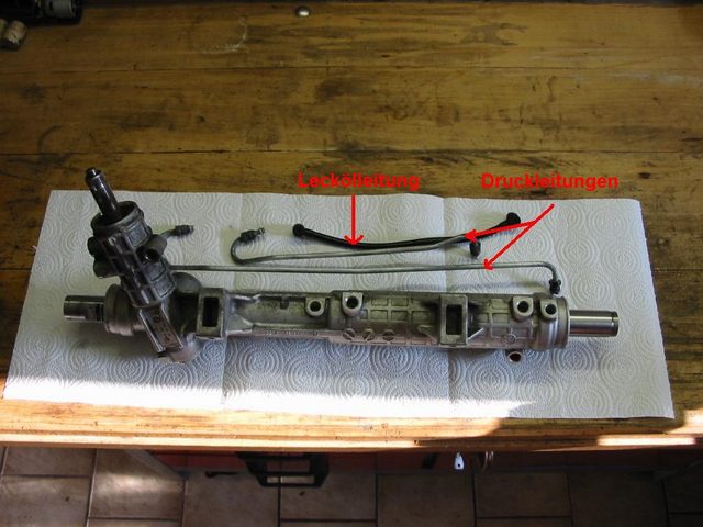 Neue O-Ringe auf die Druckleitungen aufstecken und die Leitungen montieren. Die O-Ringe der Leckölleitung auswechseln und Leitung am Gehäuse aufstecken. Während der ganzen Arbeiten immer auf absolute Sauberkeit achten, denn eingebrachter Schmutz zerstört mit hoher Wahrscheinlichkeit zuerst den Steuerzylinder und später die Servopumpe. So ein Schmutzeintrag lässt sich auch durch mehrfache Ölwechsel nicht wieder zu 100 % entfernen. Der Einbau erfolgt analog dem Ausbau. Wichtig ist, dass bei der Montage Lenkgetriebe und Lenkrad auf Mitte stehen. Bei der Montage der Spurstangen, die neuen Sicherungsbleche nicht vergessen. Die Manschetten auf ihrer Innenseite am Befestigungswulst mit Bremsenreiniger säubern, damit sie später trotz Spannband nicht vom Lenkgetriebe abrutschen. Das Anziehdrehmoment der beiden Lenkgetriebebefestigungsschrauben beträgt 42 Nm. Wenn die Hydraulikschläuche