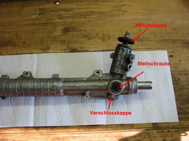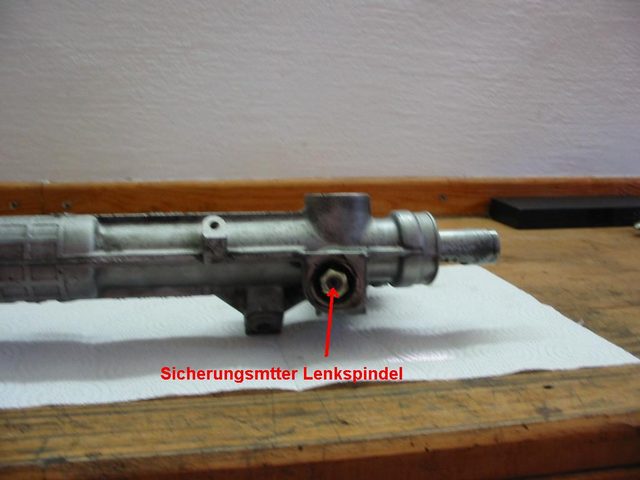 Den Radialwellendichtring (offene Seite nach oben, also zum Lenkrad hin) und das untere Führungslager (gereinigt und gefettet) der Lenkspindel wieder in das Gehäuse einbauen. Den Radialwellendichtring zwischen Dichtlippe und Staublippe mit Fett füllen. Die Lagerbuchse auf die rechte Seite der Zahnstange schieben, Verzahnung einfetten Kolbenring mit Öl benetzen und vorsichtig in das Gehäuse einschieben Den Sicherungsring einsetzen und die Zahnstange auf Mitte stellen (gemessenes Maß verwenden). Die instandgesetzte Lagerbuchse auf die Lenkspindel schieben, die Kolbenringe der Lenkspindel mit Öl benetzen und das Ritzel fetten. Jetzt die Lenkspindel so in das Gehäuse einschieben dass die Markierungen von Spindel und Gehäuse bei Zahnstangenmittelstellung fluchten. Wenn das beim ersten Versuch nicht gleich klappt dann Lenkspindel noch mal ein Stück raus ziehen und etwas verdreht einsetzen. Wenn nach erfolgtem Einbau der Lenkspindel nun die Markierungen in Mittelstellung übereinstimmen, den Sicherungsring oben einsetzen, Lenkspindel unten mit neuer selbstsichernde Mutter sichern, Mutter mit 17 Nm anziehen. Die Plastikschutzkappe oben so auf die Lenkspindel aufstecken, dass deren Markierungsnase bei Mittelstellung mit der angegossenen Gehäusemarkierung fluchtet. Die Verschlusskappe des Lenkspindelgehäuses unten mit 32 Nm anziehen und durch verstemmen oder mit Schraubensicherung sichern. Einlegeplatte und O-Ring