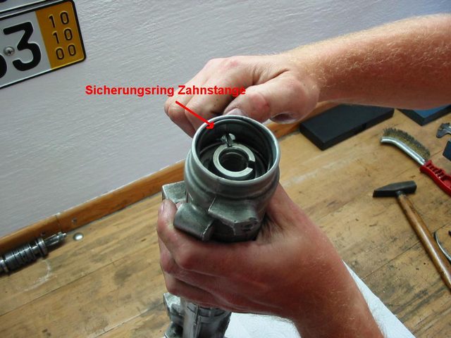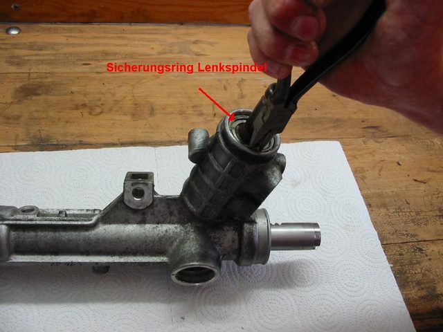 Den Sicherungsring der Lenkspindel nach oben mit einer Innensicherungsringzange ausheben. Jetzt kann die Lenksäule nach oben heraus gezogen werden. Die Zahnstange ganz nach links schieben und Sicherungsring der Zahnstange durch die Bohrung der Leckölleitung mit einem Flachschraubendreher aushebeln. Drauf achten dass die offene Seite des Sicherungsringes gegenüber der Bohrung steht und dass beim hebeln durch die Bohrung diese nicht beschädigt wird.