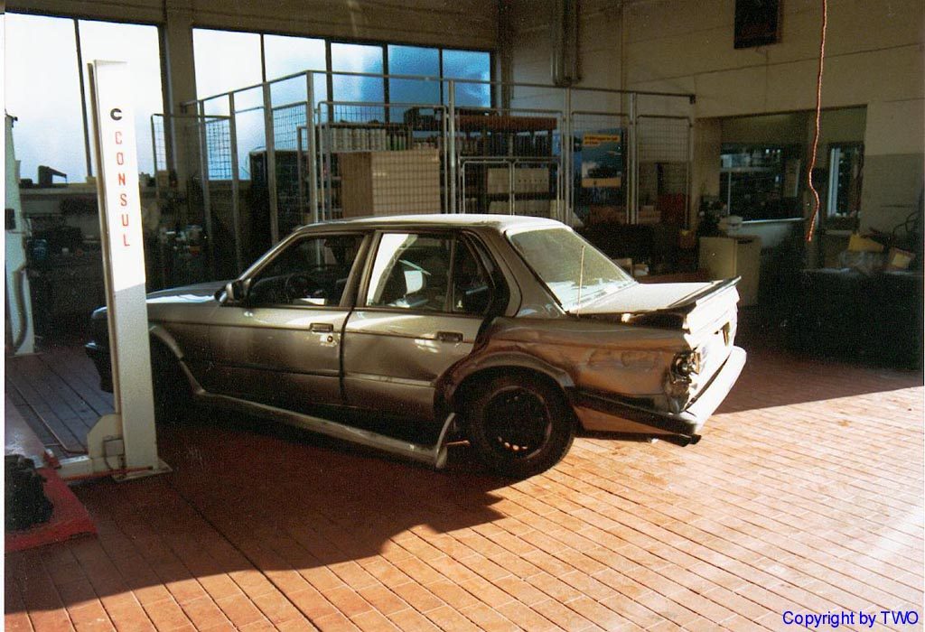 Hallo E 30 Gemeinde. Nach langem Überlegen ob ich meinen drei Wägelchen auch mal eine Fotostory gönnen sollte bin ich dann doch zu dem Entschluß gekommen mal eine loszuschicken. Angefangen hat meine Leidenschaft für den E30 im Jahr 1992 als ich mir meinen ersten 325i zugelegt habe. Es war ein 1987iger 325i M-Technik 1 in Lachssilbermetallic. Diesen erwarb ich im Juni 1992 aus Zweiter Hand mit 87tkm. Aber leider hatte ich mit diesem Wagen irgendwie kein Glück. Im Dezember 1992 ist mir durch den Abriss einer Zylinderkopfschraube ein kapitaler Motorschaden entstanden. Der Schraubenkopf der abgerissen ist kam unter eine Nocke, hat ein Loch in den Zylinderkopf geschlagen, damit ein Kurzschluss zwischen Wasser und Ölkreislauf geschaffen und eine anständige Sauerei im Motor angerichtet. Da ich leider nicht gleich kapiert habe was da los war, habe ich mir den Motor zu einem kapitalen Motorschaden gefahren. Nun gut, aus Schaden wird man klug, habe ich mich dann damals entschieden, da ja das Auto an sich Top war, einen Originalen ATM von BMW einbauen zu lassen. Mit ein paar Nebenteilen hat der Spaß damals knapp 7000.- DM gekostet. Doch der Spaß sollte nicht lange anhalten. Denn im März 1993 zog mir direkt auf der Autobahn ein Polo vors Auto, und bei dem Versuch auszuweichen kam dann das raus was auf den ersten Bilder zu sehen ist. Leider Totalschaden mit drei Monate alter und 2500km gelaufener Austauschmaschine. Ihr könnt euch denken was ich am kochen war. Schlussendlich musste das Auto aber weg, und da ich durch den Unfall, Gott sei Dank nur leicht, auch Gesundheitlich angeschlagen war, habe ich ihn mit dem ATM verkauft. Bei dem Gedanken daran blutet mir noch heute das Herz.