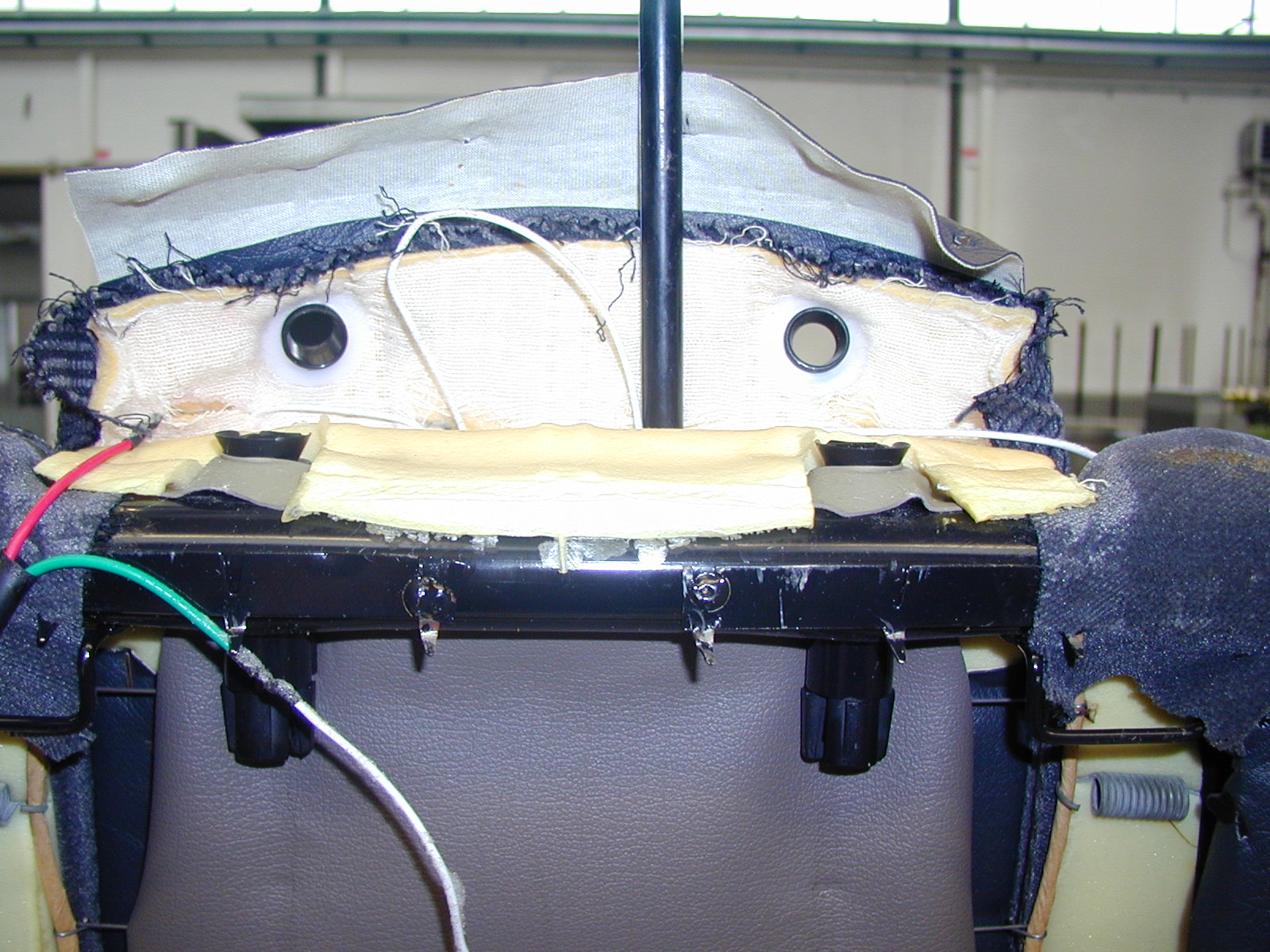 Art Metallkrampen am Drahtgeflecht noch hinter dem Schaumstoff (der Stoff würde ja sonst nicht fest am