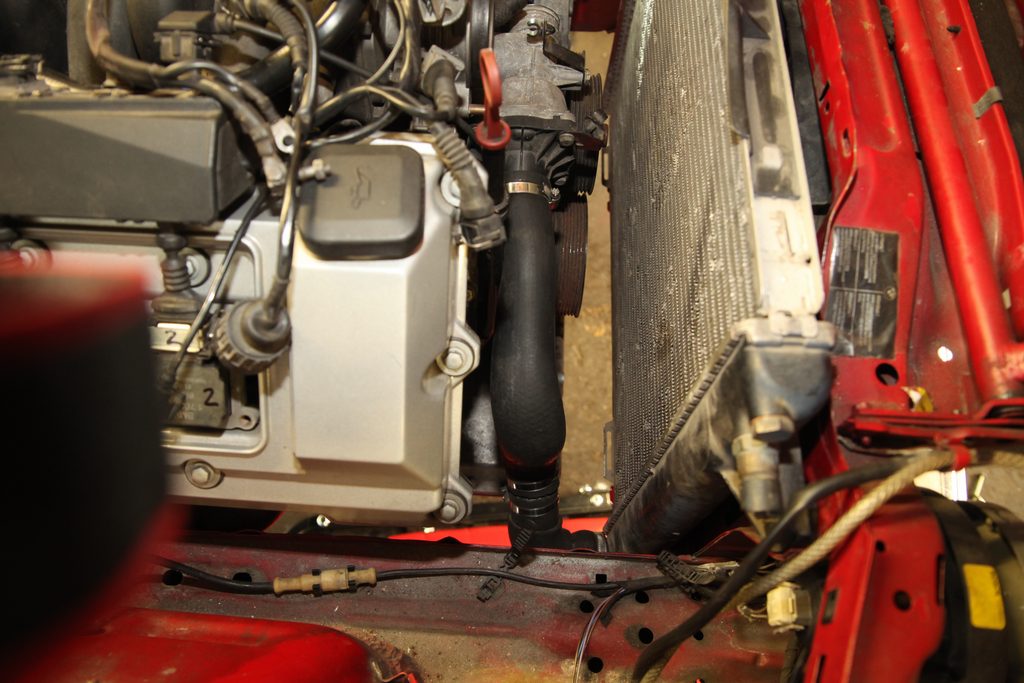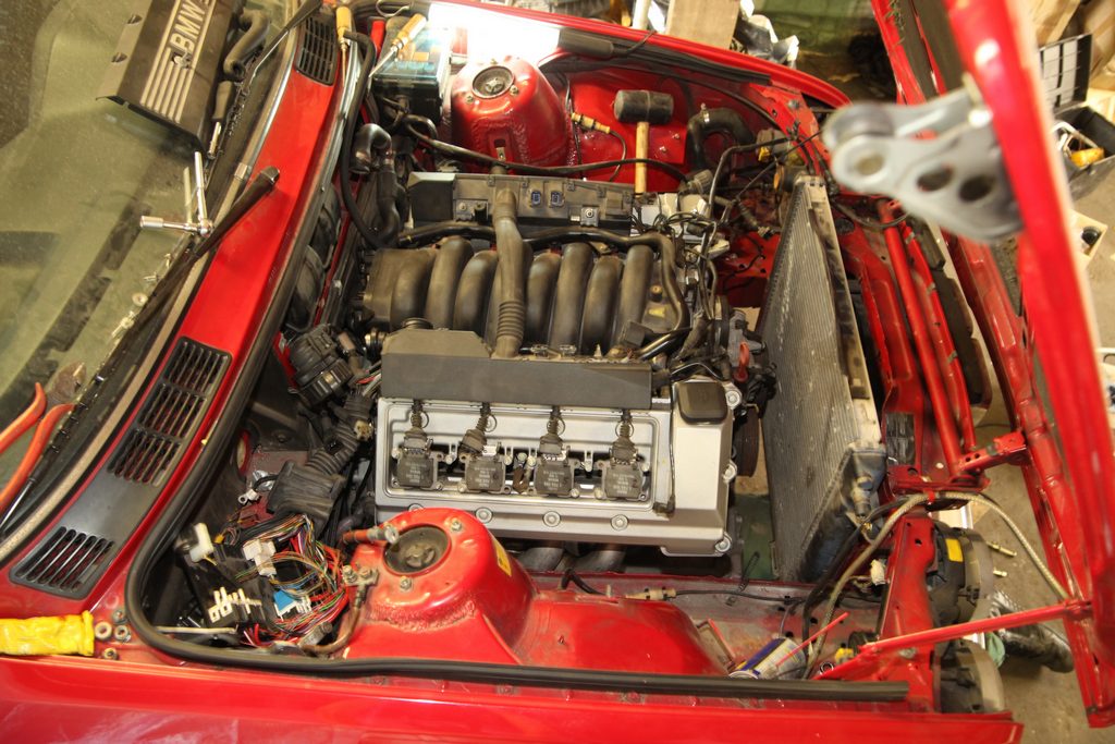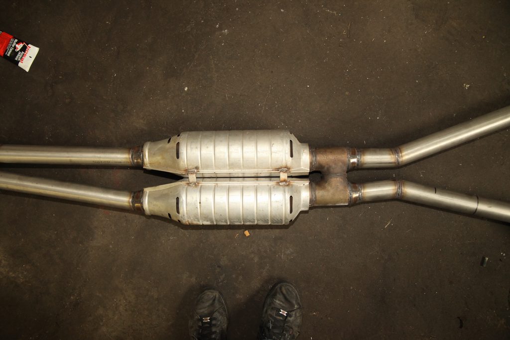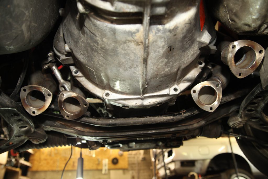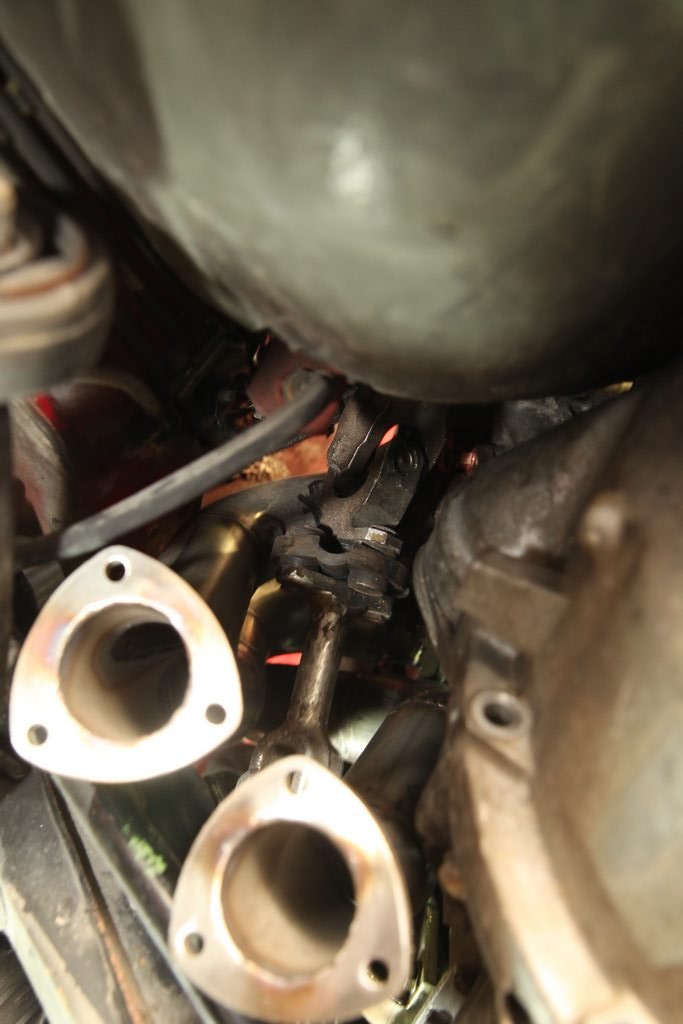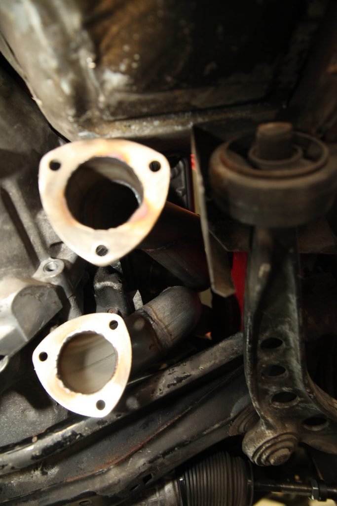 Abgasanlage Das Dauerthema beim V8 Umbau - die Anlage ist nun fertig und wurde (ausserhalb des Autos) durchgeschweisst. Die Krümmer haben wir heute ins Auto gebaut. Der linke Motorhalter muss dazu ab. Rechts klappt es auch mit montiertem Motorhalter. Auf der Fahrerseite geht die Lenkung durch die Krümmer hindurch. Ganz schön knappe Sache und sehr fummelig beim Einbau.