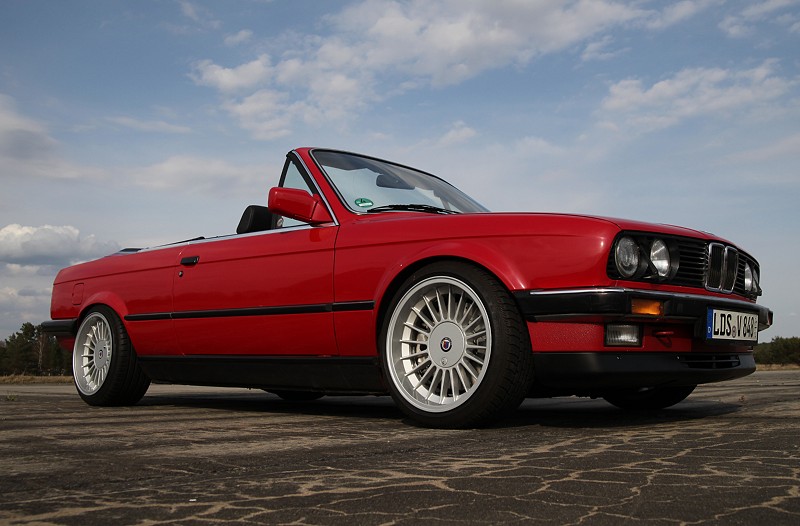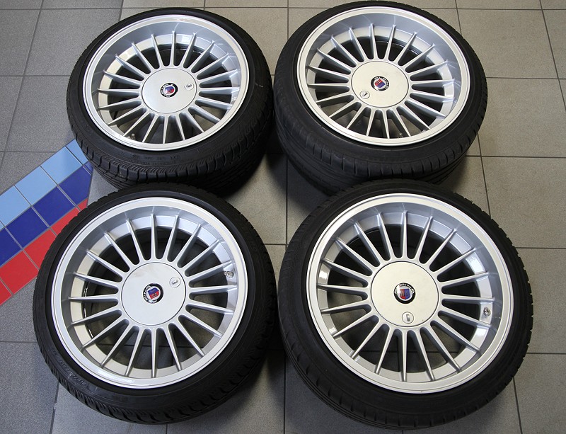 ![]() Allgemeines Die ALPINA Felge in 17 Zoll wurde erstmals 1986 am ALPINA B12 (E32) vorgestellt. Später wurde sie auch am E34 B10 eingesetzt. Die großen Speichen sorgen für ein leichtes, luftiges Design. Insbesondere bei fahrendem Auto gibt die ALPINA Felge einen interessant verschwommenden Blick auf die Bremse frei. Durch ihre schlichte Gestaltung ist es eine sehr dezente Felge, welche selbst in abartigen Dimensionen das Fahrzeug immer noch seriös aussehen läßt. Vorteile Die ALPINA 17 Felge besitzt folgende Vorzüge: - perfektes, zeitloses Design - sehr gute Bremsenbelüftung - beachtliches Felgenbett, welches hervorragend zu klassischen BMWs passt Nachteile Kleinere Nachteile gibt es auch: - am E30 etwas bremsenkritisch - ET für E30 Verhältnisse recht niedrig - preislich hoch angesiedelt - recht hohes Gewicht Preisniveau Gebrauchte Angebote (Stand 2014): 800-1200 EUR E32/E34 VA ALPINA 3611628 8,5x17 ET14 mit 235/45 (mit Kante) ALPINA 3611638 8,5x17 ET12 mit 235/45 E32/E34 HA ALPINA 3611629 10x17 ET28 mit 265/40 (mit Kante) ALPINA 3611639 10x17 ET28 mit 265/40 ALPINA 3611637 9,5x17 ET24 mit 265/40 Einzelteile Nabendeckel: 36 10 053 ALPINA Emblem: 36 13 005 Seltener sind die frühen Ausführungen 628 und 638 mit einer Kante am Außenrand der Felge. Diese Felgen sind auch auf dem Bild ganz oben zu sehen. Die normale und wesentlich häufiger anzutreffende Ausführung des Außenrandes ist die "kantelose", siehe Foto: ![]() Verbaubare Bremsen - 292x22 bzw. 294x22 mit E36 Sattel - 300x28 mit 540i Sattel - 315x28 M3 E36 Bremse (leider verursacht die M3 Scheibe schon selbst mind. 13mm Spurverbreiterung) - 315x28 Spezialbremse mit flacher Scheibe und 540i Sattel Varianten am E30 Um die ALPINA Felge fahren zu können, muss zunächst vorn und hinten auf 5x120er Lochkreis umgebaut werden. Dies kann mit rundum M3 E30 Teilen oder vorn mit Spezialradnabe und hinten mit Z4 Naben realisiert werden. Hier eine paar mögliche Kombinationen: Variante 1: VA: 8,5x17 ET14 mit Bereifung 215/40 HA: 9,5x17 ET24 mit Bereifung 245/35 Alternativ 2: VA: 8,5x17 ET14 mit Bereifung 215/40 HA: 8,5x17 ET14 mit Bereifung 215/40 Alternativ 2: VA: 8,5x17 ET14 mit Bereifung 215/40 HA: 10x17 ET28 mit Bereifung 245/35 Montagebeispiele Jens hat diese platztechnisch anspruchsvolle Felge in 8,5x17 rundum mit 215/40 Reifen montiert. Es wurde mit M3 E30 Achsen auf 5x120 Lochkreis umgebaut. ![]() ![]() Am M3 E30 passt die Felge natürlich auch ran, aber nicht ganz problemlos. Vorn schleift die Haltespange der vorderen Bremse an der Felge. Entweder auf 300x28 umbauen oder die Spange modifizieren oder Beläge runterfräsen oder eine kleine Distanzscheibe verbauen. ![]() tino@e30.de |