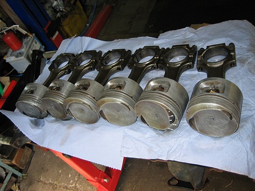 Die 130mm Pleuel werden an die 325i Kolben montiert.
