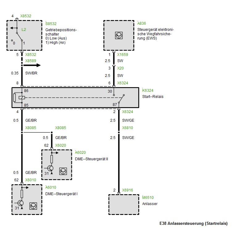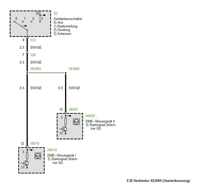Am Pin 1 und 2 wird die DME mit Zündplus (Klemme 15) beaufschlagt. Die Pins sind entsprechend mit den Pins 6 und 7 am E30 Motorstecker zu verbinden. Der Anlasser wird im E38 750i von der DME über ein Startrelais angesteuert. Versorgt für das Relais über das schwarze Kabel X20 Pin 3, welches bei Varianten ohne oder mit rausprogrammierter EWS gegen Zündplus oder Dauerplus gelegt werden kann. ![]() Die Pin 4 und 5 können leer gelassen werden, da Sie nur die Verbindung zwischen der Diagnosedose im E38 Motorkabelbaum und den weiteren diagnosefähigen Steuergeräte in der E38 Karosserie herstellen. Im E30 gibts nichts diagnosefähiges im Innenraum. Der Pin 6 für den Öldruck ist mit dem Pin 5 am E30 Motorstecker zu verbinden. Hin und wieder ist der Pin 6 am X20 Stecker des M73 leer, dann entsprechend den Öldrucksensor suchen und nachverdrahten. Um den DMEs den Startwunsch vom E30 Zündschloß zu übermitteln ist der Pin 7 am X20 zu nutzen und mit dem E30 Motorstecker Pin 18 zu verbinden. ![]() Der Pin 8 ist mit 10A abzusichern und gegen Dauerplus zu legen. . Die Ladekontrollleuchte im Cockpit wird über den Pin 9 angesteuert und ist mit dem E30 Motorstecker Pin 1 zu verbinden. Die Pin 10 und 11 verbinden das E38 Cockpit mit dem Doppelwassertemperatursensor zur Anzeige der Kühlwassertemperatur. Die gelieferten Werte sind nicht e30 kompatibel. Wird ein E30 Cockpit verwendet, ist am V12 Motor zusätzlich ein (einpoliger) E30 Kühlwassersensor zu verbauen und mit dem E30 Motorstecker Pin 4 verbunden. Die Benzinpumpe wird von der E38 DME mittels eines Massesignals an Pin 12 aktiviert. Somit muss ein zusätzliches Benzinpumpenrelais im E30 nachgerüstet werden. Dazu kann jedes handelsübliche Standardrelais genutzt werden, oder halt eines aus dem E38 Schlachltfahrzeug. ![]() Steht ein kompletter Spender zur Verfügung kann das fahrzeugseitige Gegenstück großzügig aus dem E38 herausgeschnitten werden und daraus der benötigte Adapter hergestellt werden. ![]() In der Nähe des X20 hängt noch ein dreipoliger Stecker rum, der aber beim E30 Umbau wenig Relevanz besitzt.