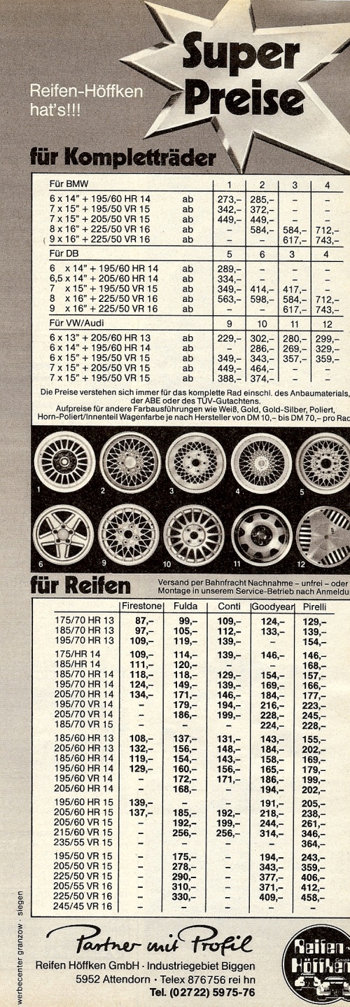 Reifen-Höffken liefert 1985 die Radialspeiche ab 342 DM an, was